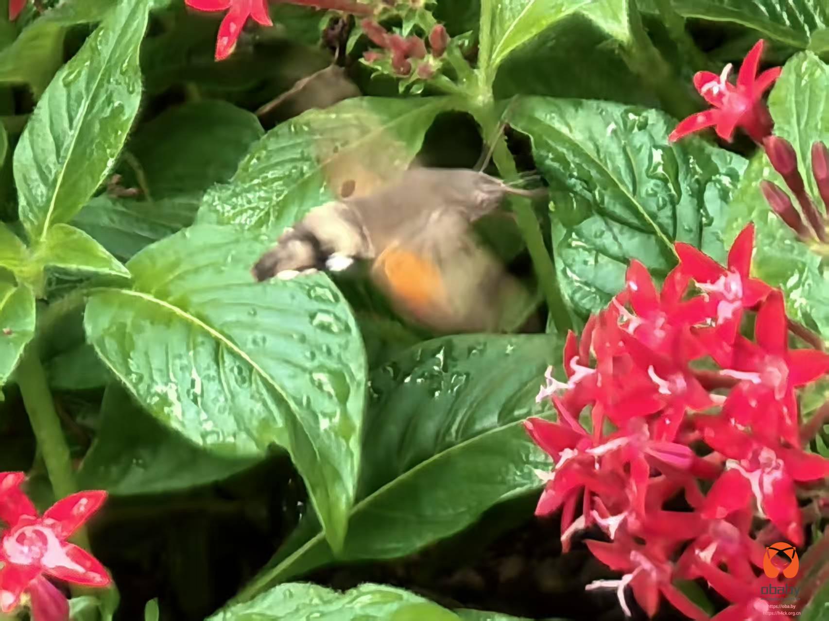 在花坛里又看到了那种胖胖的蜂鸟蛾,振翅在花间吸食花蜜。